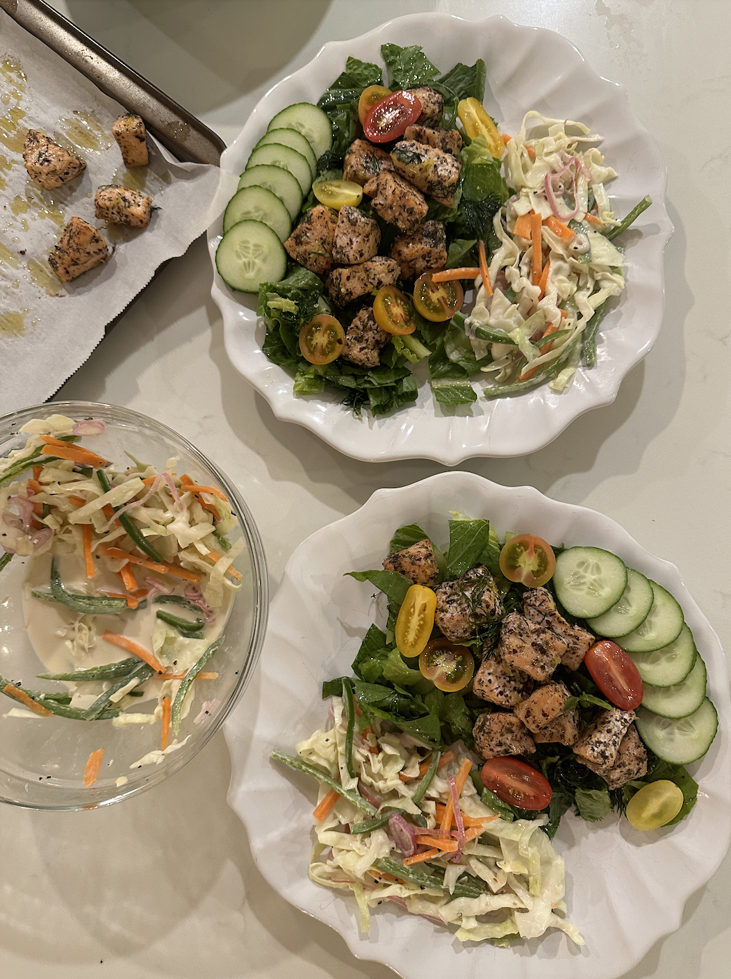 To serve: toss romaine lettuce with desired amount of dressing. Top with salmon, cucumber, and cherry tomatoes. Serve with jalapeño slaw on the side.